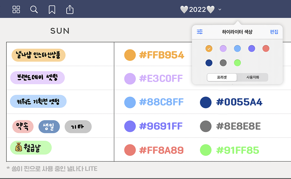 제가 사용하고 있는 크림그레이와 잘 어울리는 형광펜 컬러코드를 공유해드릴게요!