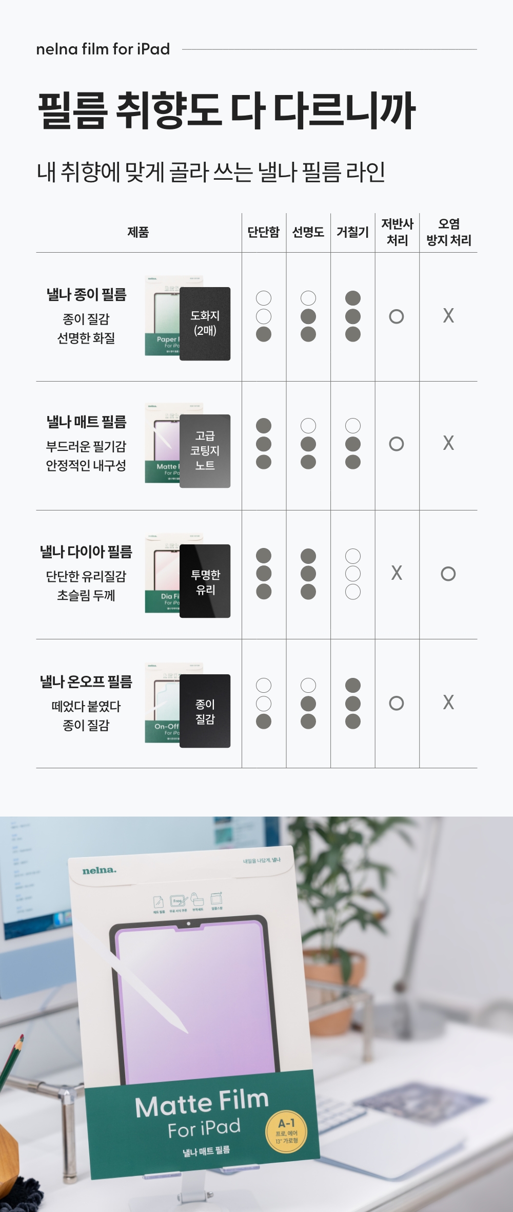 고급 코팅지의 부드러운 필기감과 안정적인 내구성을 모두 갖춘 낼나 매트 필름